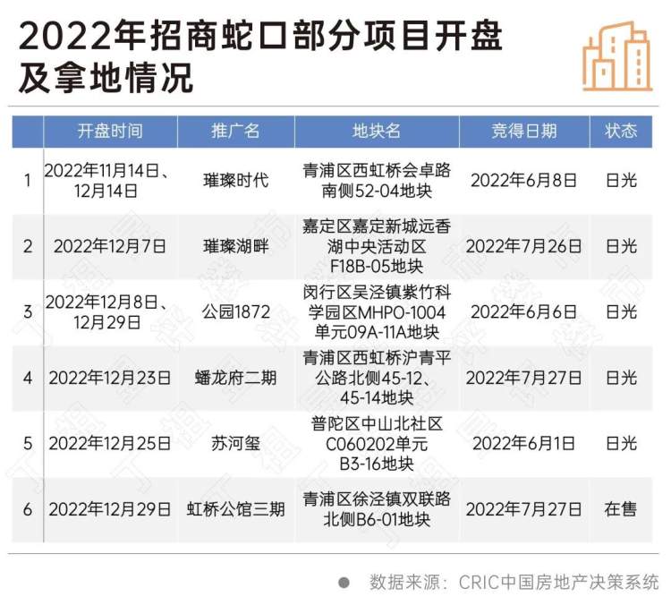 据不完全统计,2022年招商蛇口上海公司当年拿地10宗,累积权益金额212.96亿元,最终实现年内开盘6宗,几乎所有项目开盘即清盘。