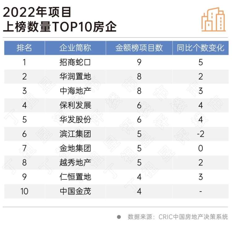 CRIC数据显示,《2022年中国房地产企业项目销售TOP100排行榜》中,招商蛇口共有9个项目入销售金额榜,为2022年销售金额项目数最多的房企。