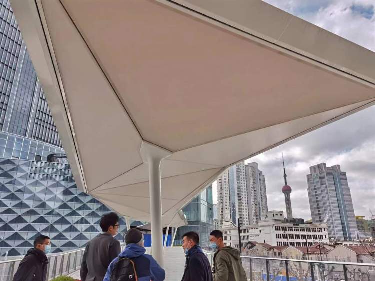 袁俊杰还告诉记者,一期连廊是沪上首个带膜结构的阳光棚连廊。膜结构的折面阳光棚形如飘带,象征飘扬的船帆。桥身上采取的是由桥体到边缘逐渐变薄的设计,加上钻石型的桥体外立面,整个连廊就像一艘反射着波光的船。连廊的桥柱也并非传统的垂直方向,而是斜向的,就像船在海面时锚的样子。