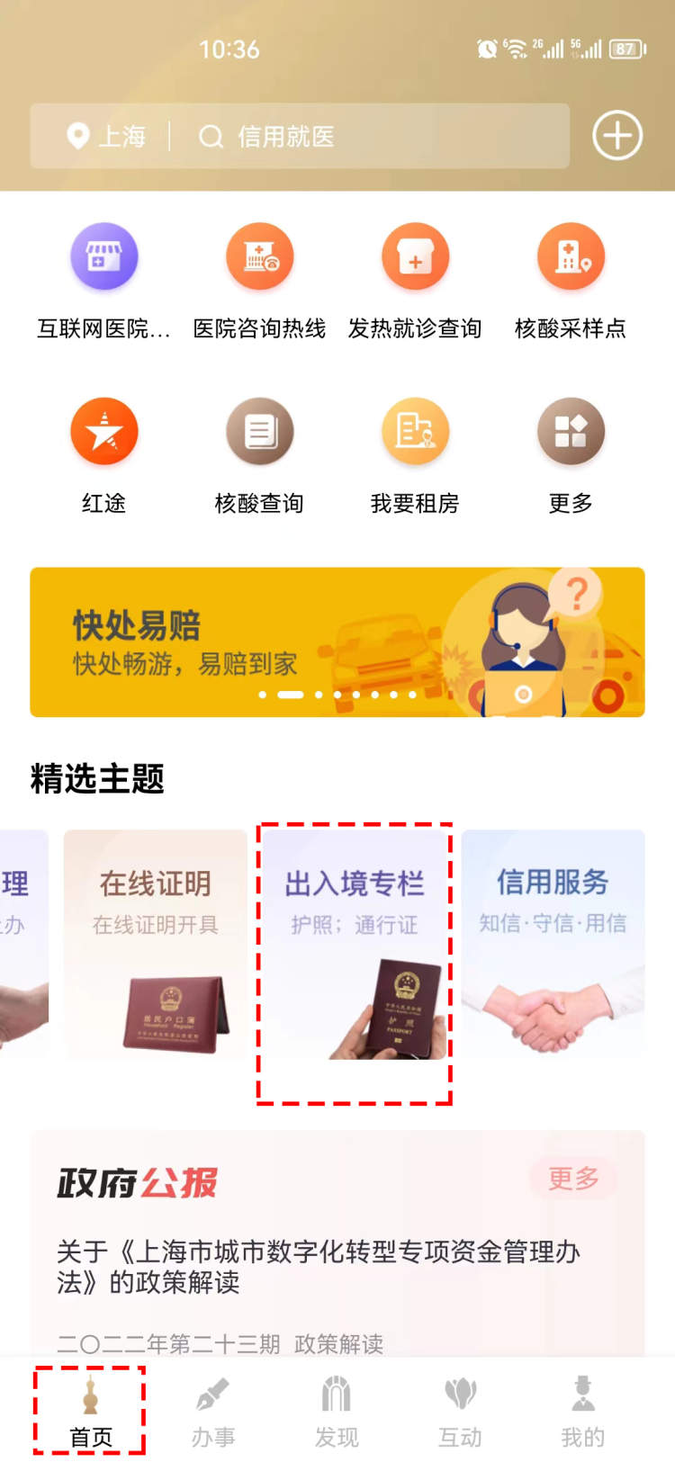 登录“随申办市民云”APP→点击首页“精选主题”中的“出入境专栏”,即可进入服务页。