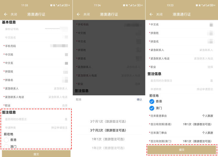 填写并确认个人信息,选择签注信息(选择前往地、来往事由、签注有效期)后,提交申请→耐心等待预审通知