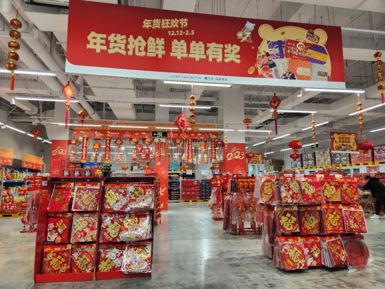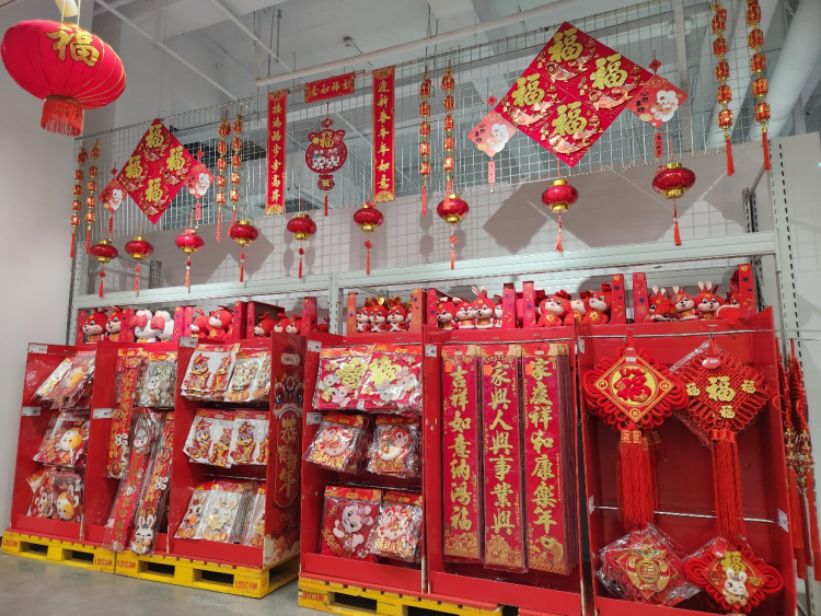 寓意美好的春联年画、兔年限定的“兔子玩偶山”、过年必备的糖果零食紧随其后……麦德龙沪太路店中,迎春节的喜庆氛围浓厚,独特的仓储式风格造就通透明亮的空间,想要购买的商品轻松就能找到。