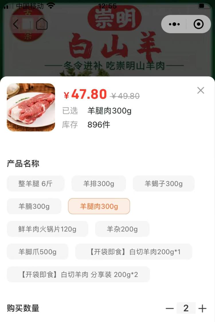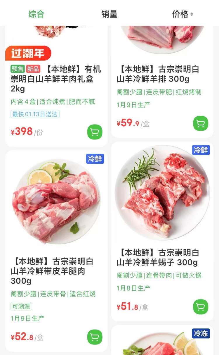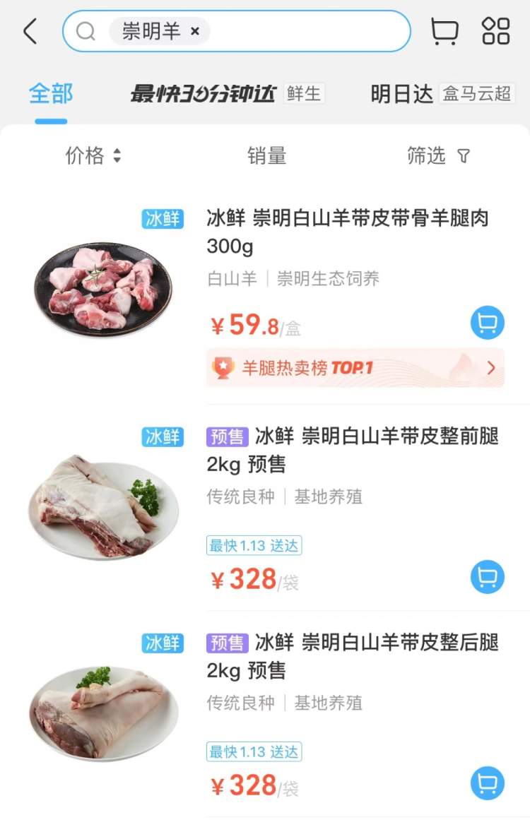 在上海新春农副产品大联展线上平台“鱼米之乡”上,崇明白山羊的销量不错,供货方来自上海古宗白山羊专业合作社、上海万禾农业科技有限公司和上海小姚白山羊专业合作社,都是崇明颇具规模的白山羊养殖基地。以一款300克的崇明白山羊带皮带骨羊腿肉为例,该平台的售价为47.8元,而在另外两个电商平台价格分别为59.8元、52.8元。