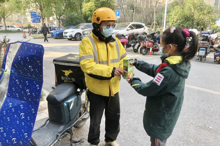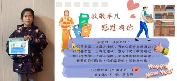 虹外一小三(1)蒲公英中队的茅易昕同学,用前不久信息课上学会的绘图软件制作了一张主题为“致敬平凡 感恩有你”的电子明信片,用稚嫩但充满感恩的口吻表达了孩子们的一份敬意,送给城市中身边平凡坚守岗位的护工、快递员和环卫人员。三(6)小蜻蜓中队的曹悦文同学给每一位快递员送出新春祝福的明信片。四(1)动力小火车中队的李蕙妍同学看到小区内送货的外卖小哥刚送完单还没来得及吃午饭,就给他送上“一盒果汁”慰问祝福辛劳,并且写下了一首诗歌赞扬他。