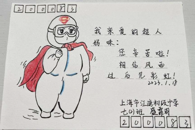 江湾初级中学七(2)班盛霏羽同学的护士妈妈在春节期间也穿着厚厚的防护服、戴着面屏、忙碌地为病人进行治疗。作为一名医务工作者,她坚持在岗,履行着自己的职责;作为女儿,她下班后还要照顾同时得了肺炎的外公、外婆和太婆。盛霏羽制作了一张明信,送给她妈妈,也送给自己作为新年的特殊纪念。盛霏羽说:“我为妈妈和每一位医务工作者感到骄傲!”